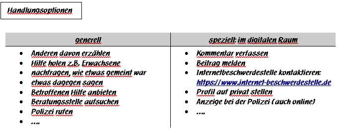Hinweis: Sollten die Schüler:innen Handlungen vorschlagen, die problematisch sind (z.B. selbst Gewalt anwenden, oder sich selbst in Gefahr bringen), dann nicht (direkt) aufschreiben, sondern in die Klasse rückfragen, ob das alle gut finden, oder was daran problematisch sein könnte.